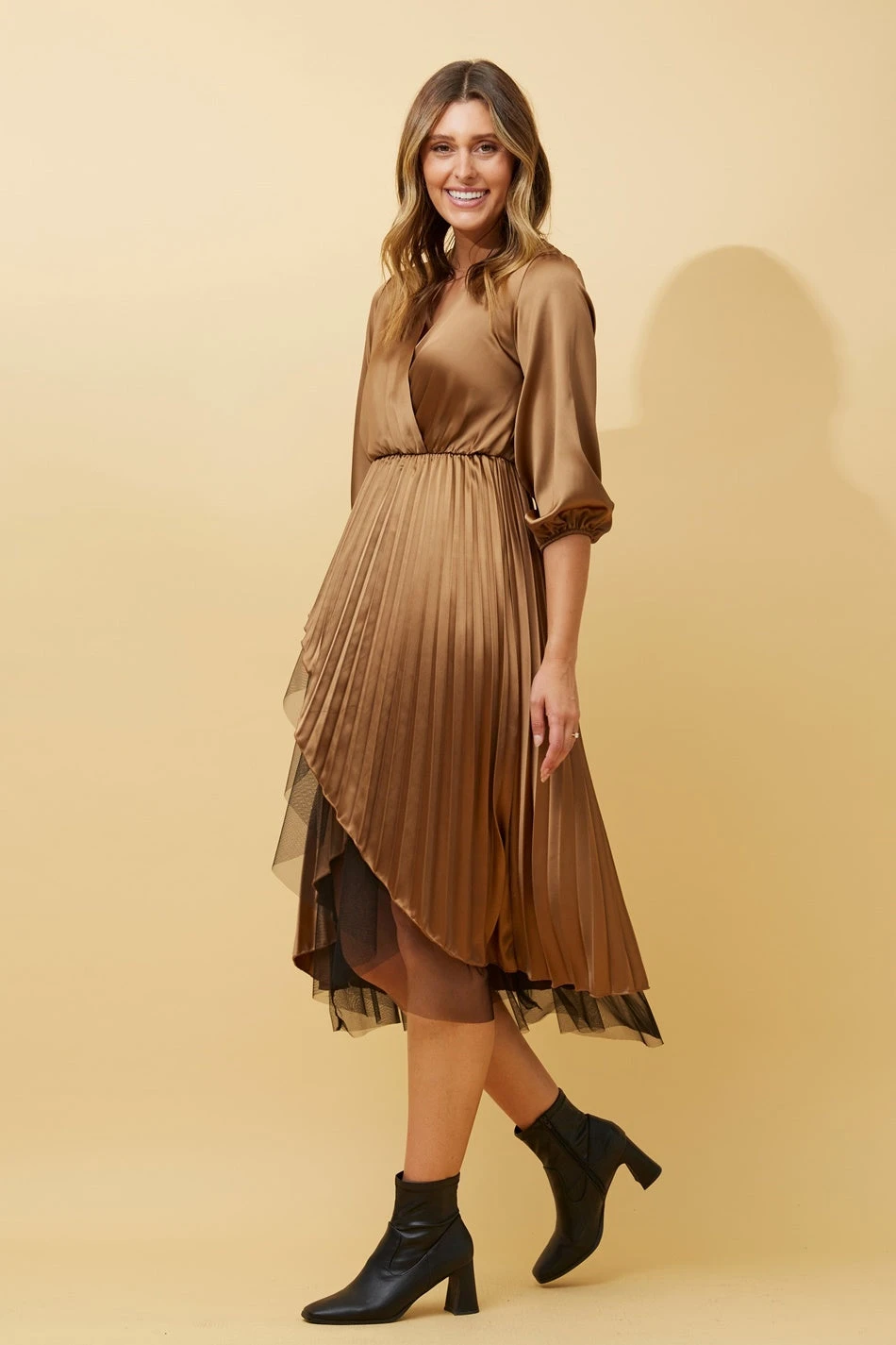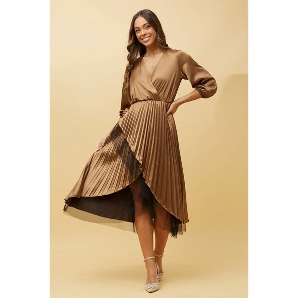 This pleated wrap style midi dress is perfect for attending smart daytime functions. In a striking pleat pattern with contrasting lace detail hem and a flattering wrap over bust, this dress will keep the heads turning!