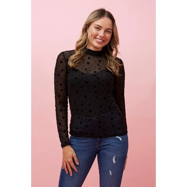 Featuring a high neckline, long sleeves and star print, this beautiful mesh top is perfect for your informal evenings. Easy to pair with everything from everyday jeans to dressy skirts, finish your look with boots or evening heels!