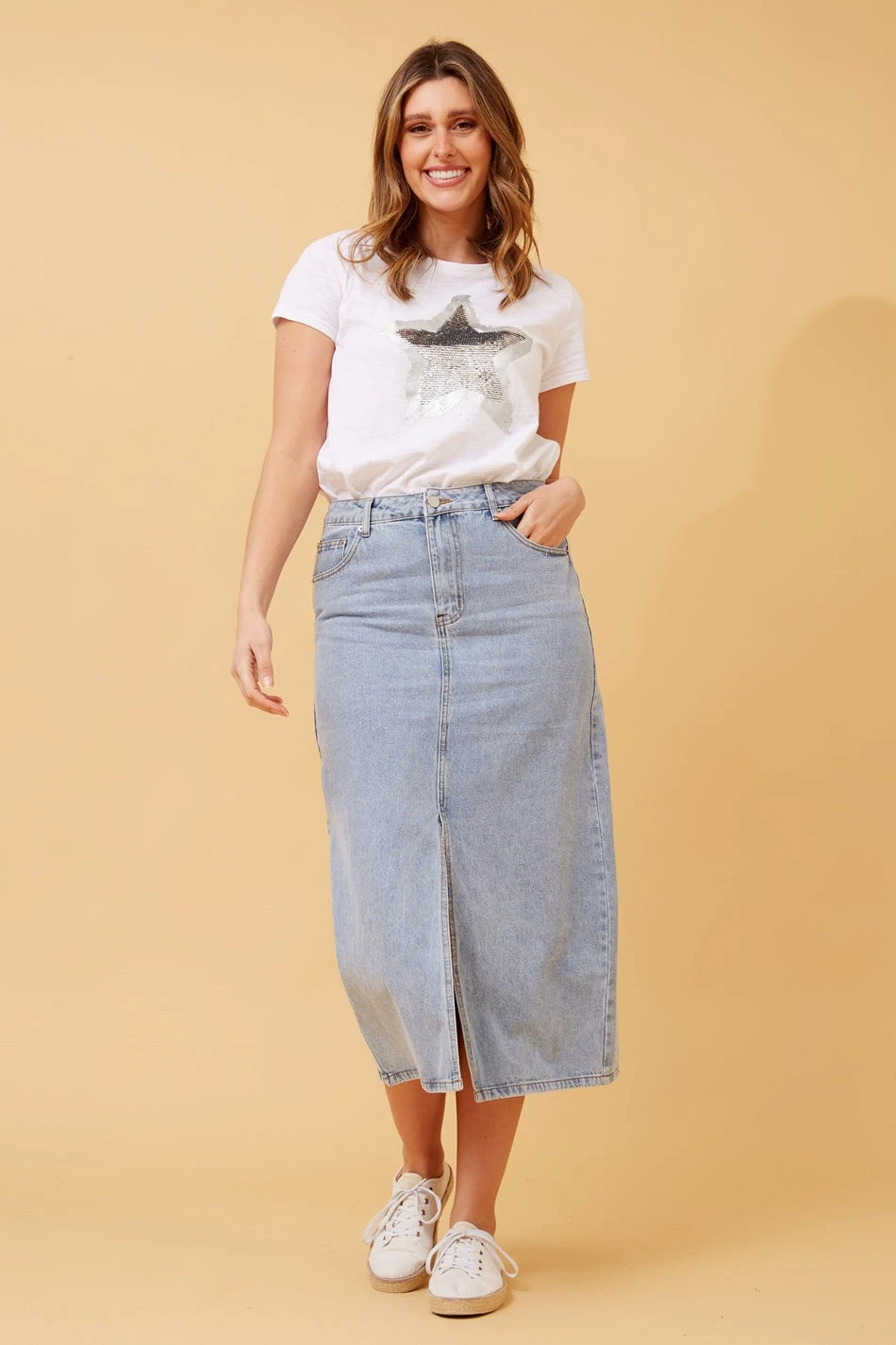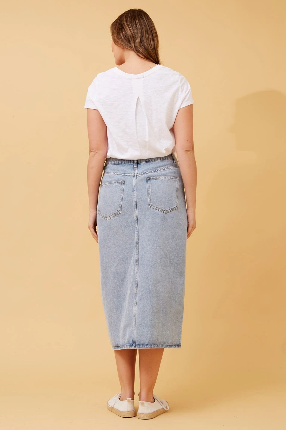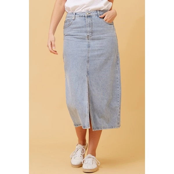 Step up your denim game with our denim midi skirt. This trendy skirt features a stylish front split, adding a touch of sass to your casual looks. Whether you’re heading to brunch with friends or a night out on the town, this denim skirt is sure to make a statement.