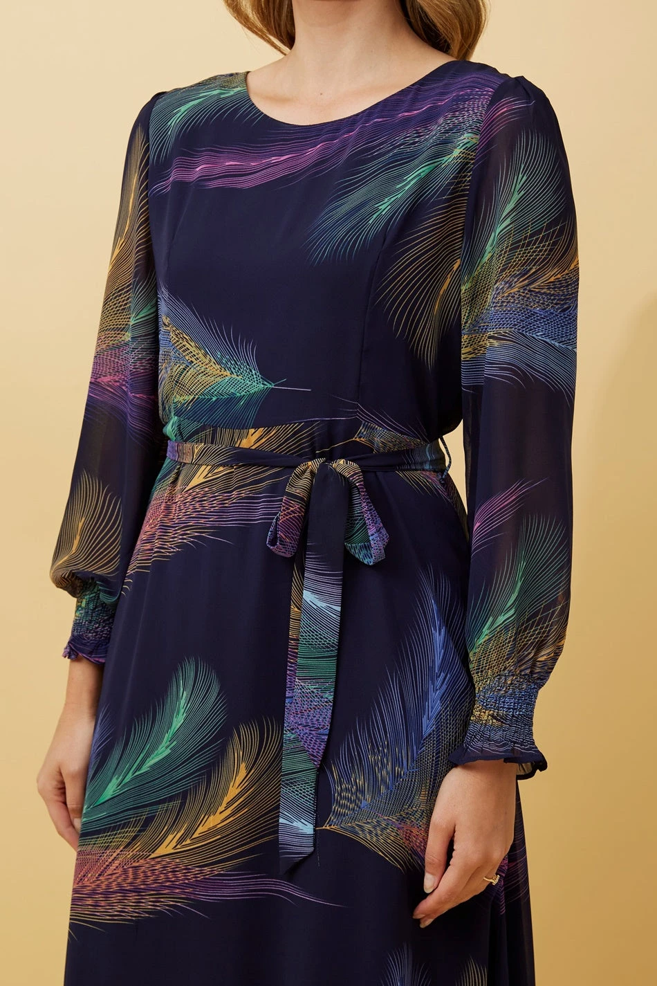 Priscilla Dress features a sweet feather print with gorgeous balloon sleeves and shirred cuff details. With a waist tie and floaty partially sheer skirt, this dress is perfect for your next brunch date. Match this with heels and minimalist earrings to complete that elegant look!