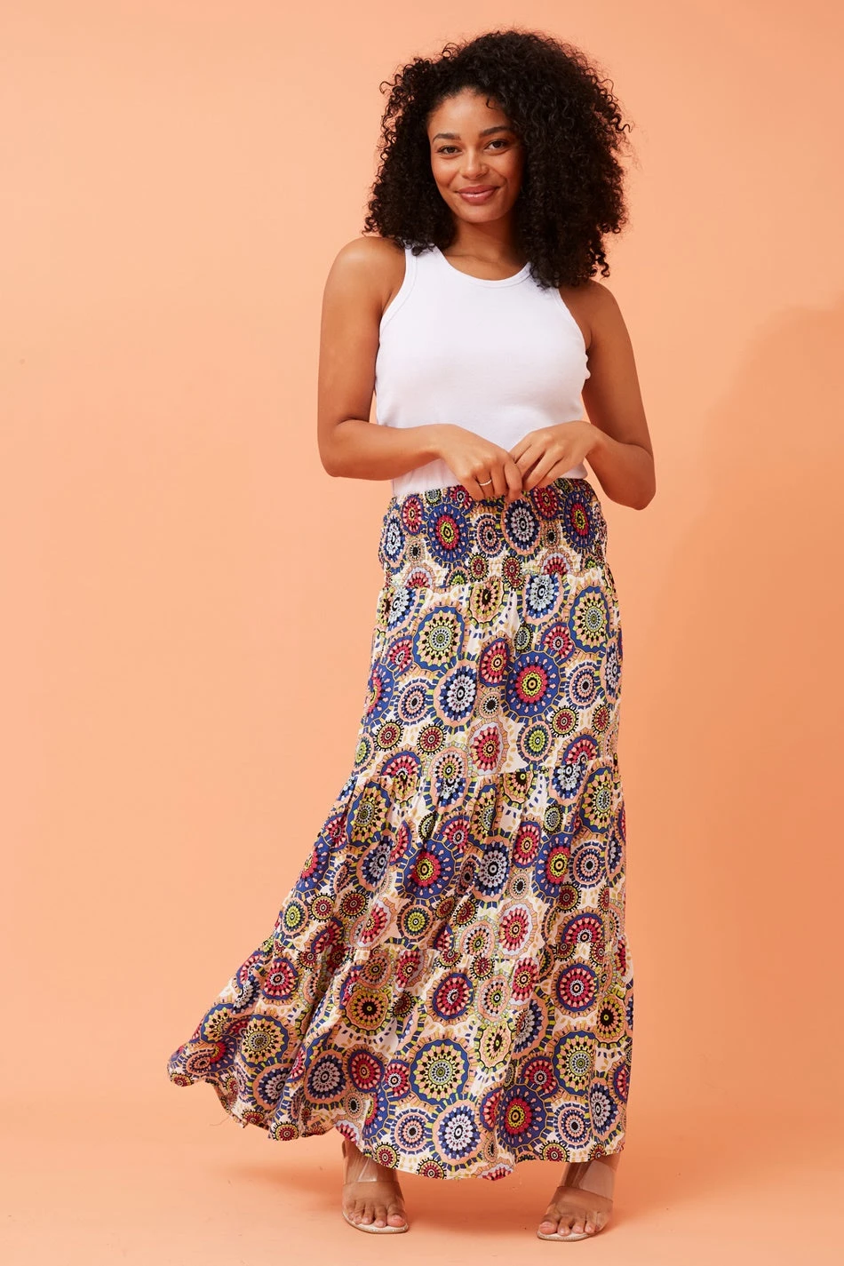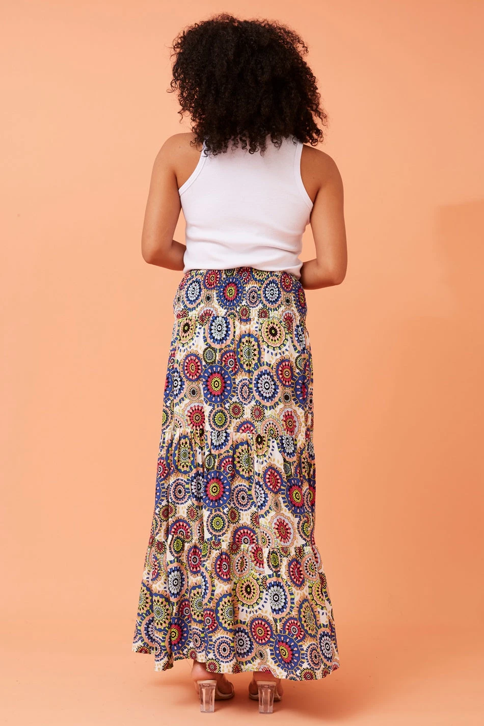 Our Bettina abstract boho print tiered skirt is a gorgeous addition to any wardrobe. Style with a blouse and heels for an elegant and stylish office look or style with a statement graphic tee and heeled boots for an elevated chic look!