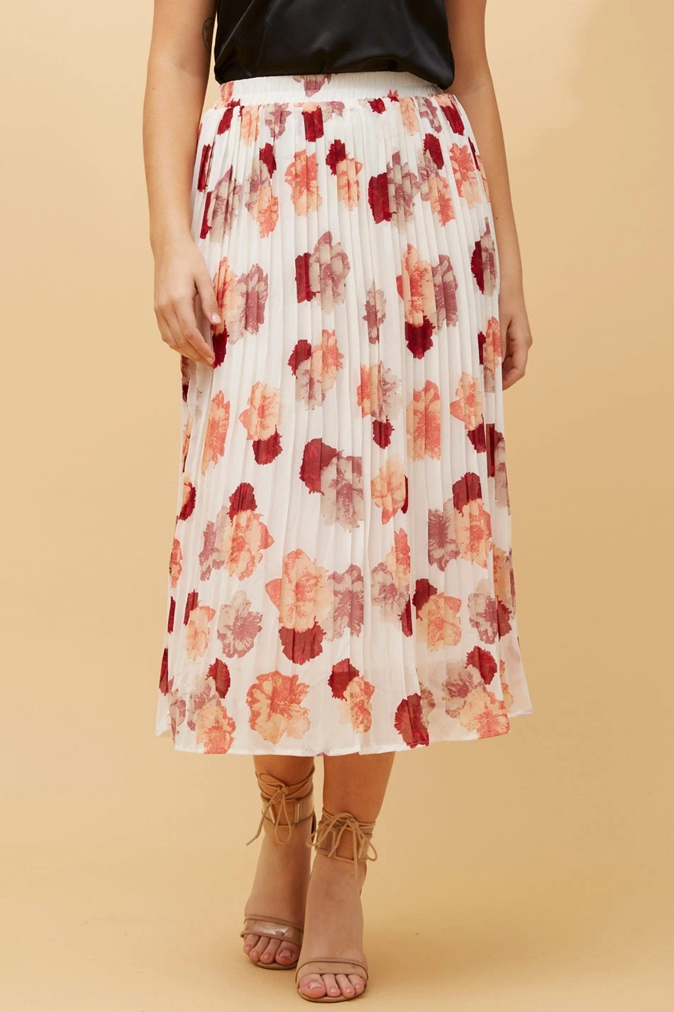 Revamp your wardrobe with our lightweight floral pleated skirt. Pair it with a cami and sandals or heels for a stylish, refined look. For an edgy twist, style it with a bold graphic tee and heeled boots.