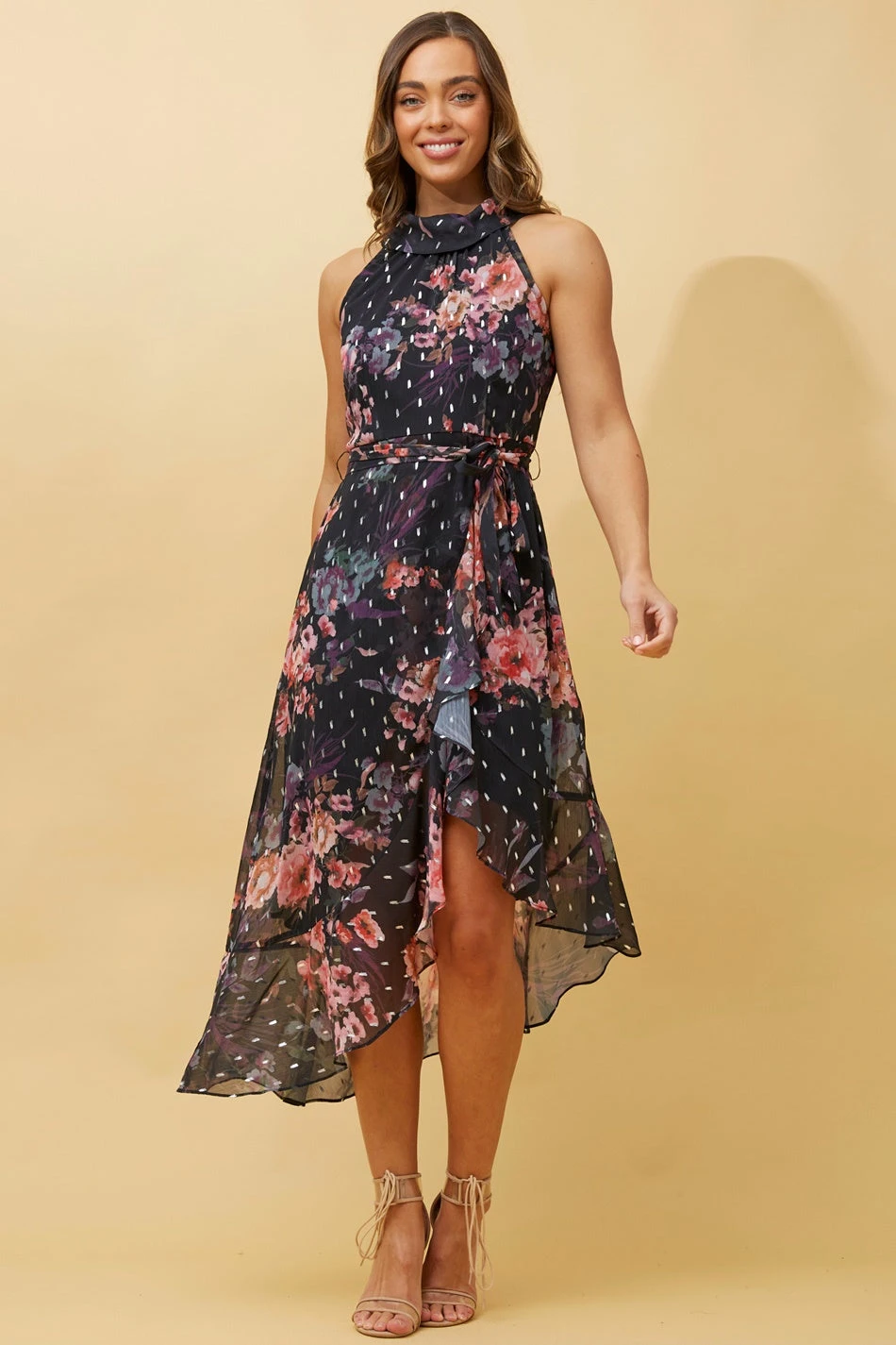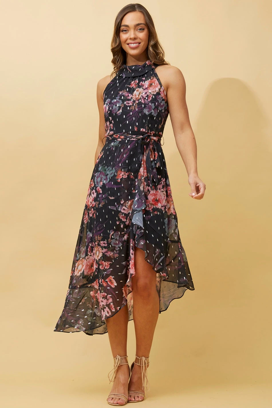 Step out in the seasons favourite style in this perfect halter neck dress. Perfect for your next sunny day event with the addition of sandals or dress it up with a heel for a night look.