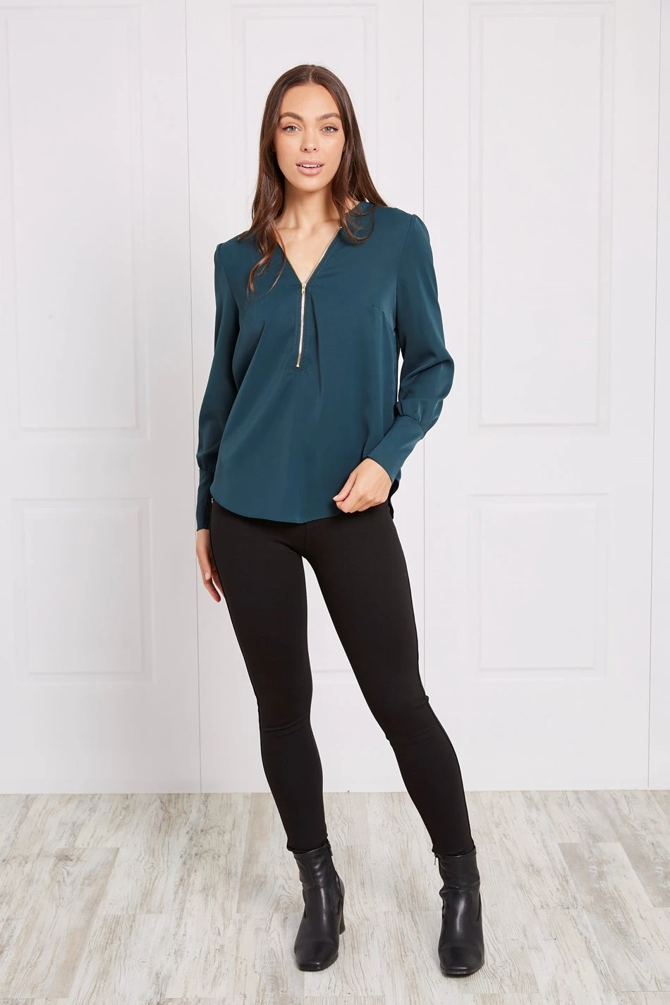 A beautiful going out top which is perfect for the new season. It has long sleeves with broad cuffs and zip front detail. Wear with strappy sandals , skinny pants and a clutch for a stunning look.