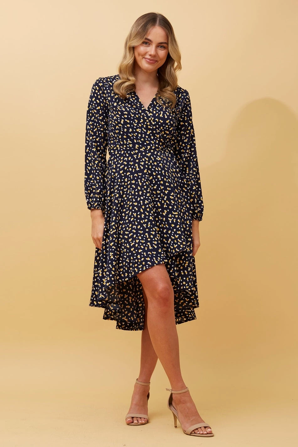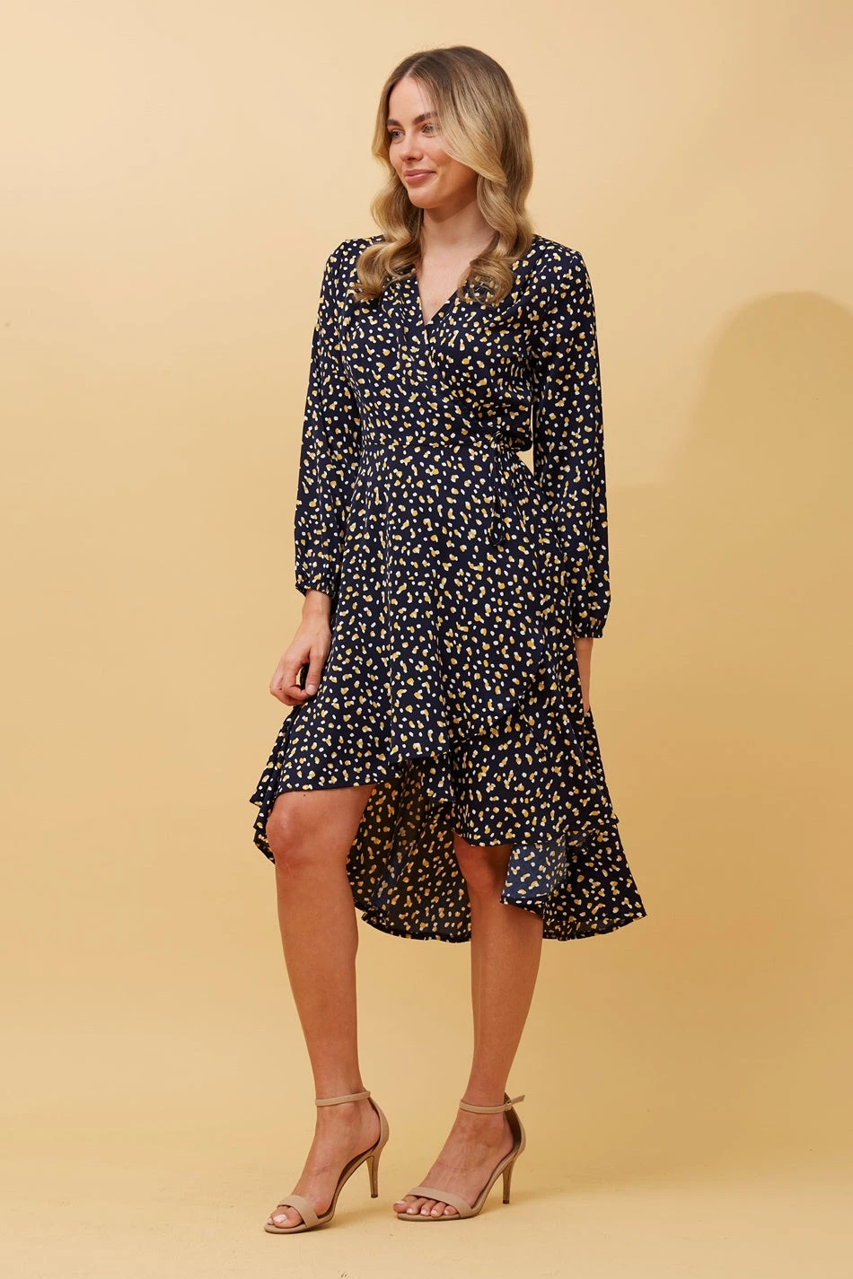 Add this gorgeous wrap dress to your wardrobe. Fabricated from a lightweight fabric with a delicate print. Designed with a wrapped feature and secured through a self side tie fastening and ease this beautifully draped front dress. Team perfectly with strappy heels or ankle boots.