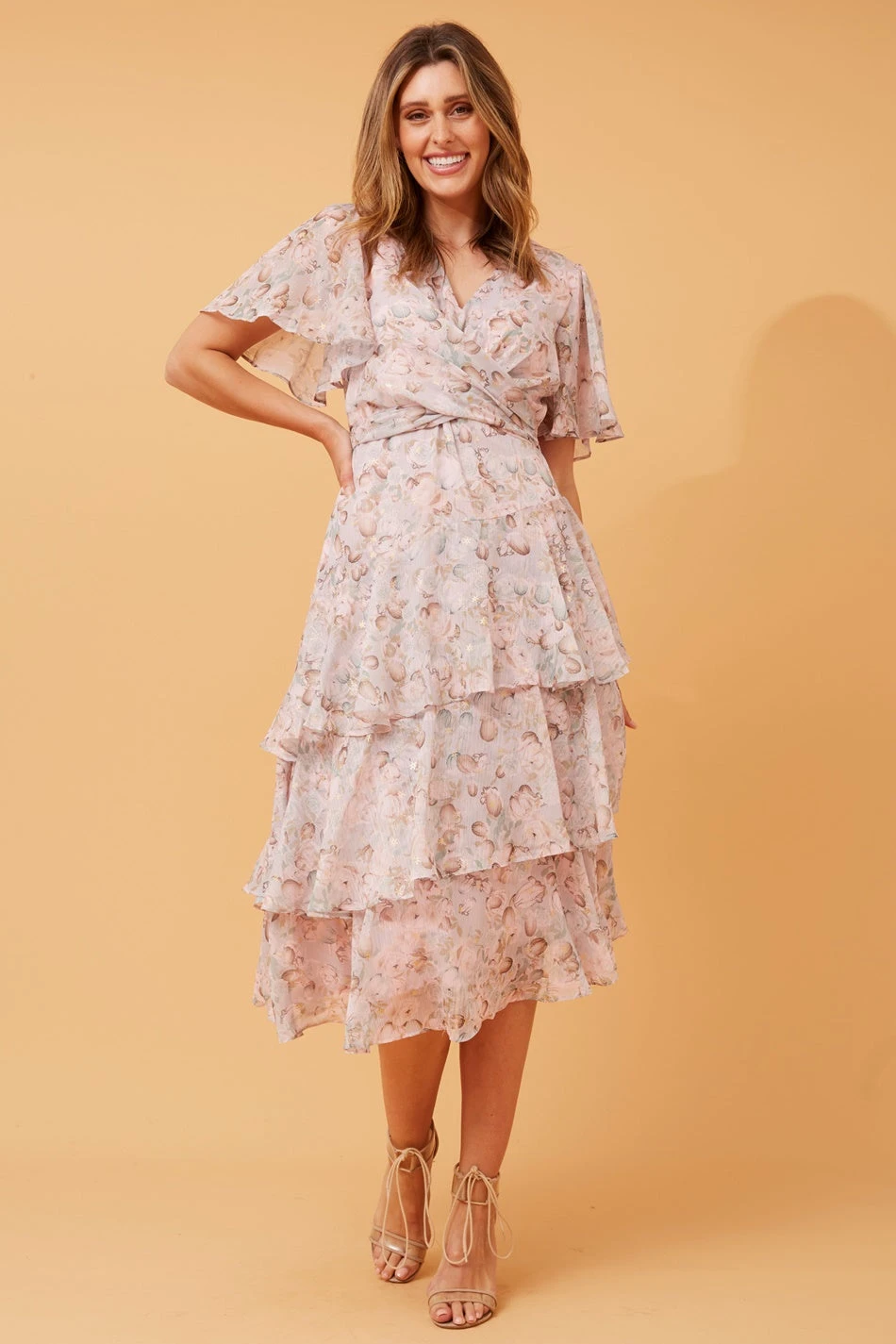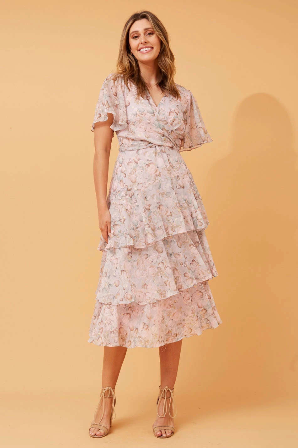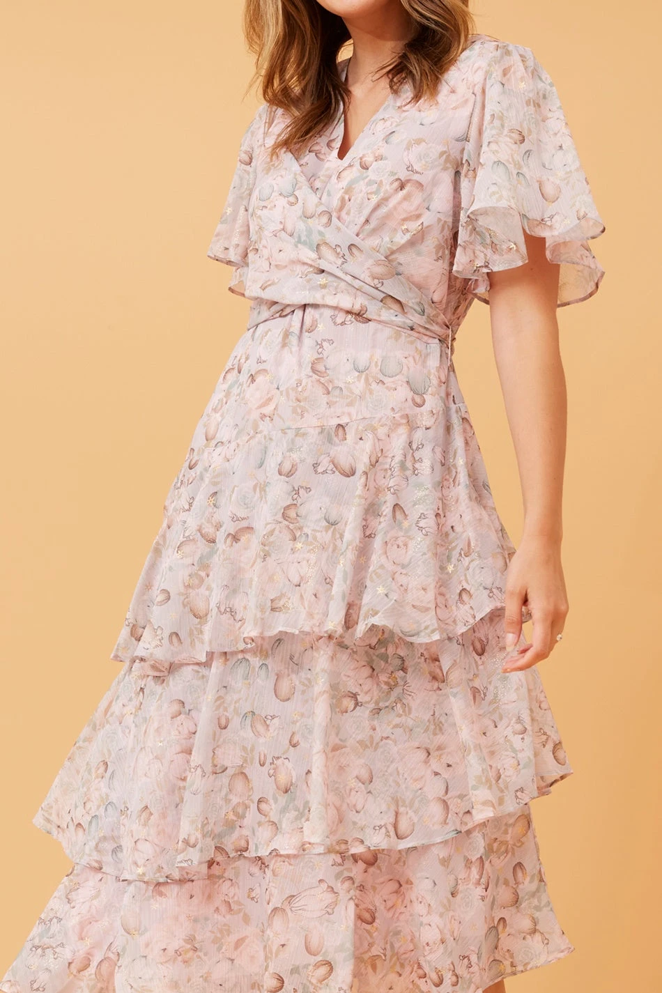 This delightful dress boasts a lively floral print adorning tiered layers, creating a whimsical and romantic aesthetic. The short sleeves add a touch of playful charm, while the wrap-around waist tie allows you to define your silhouette with grace.